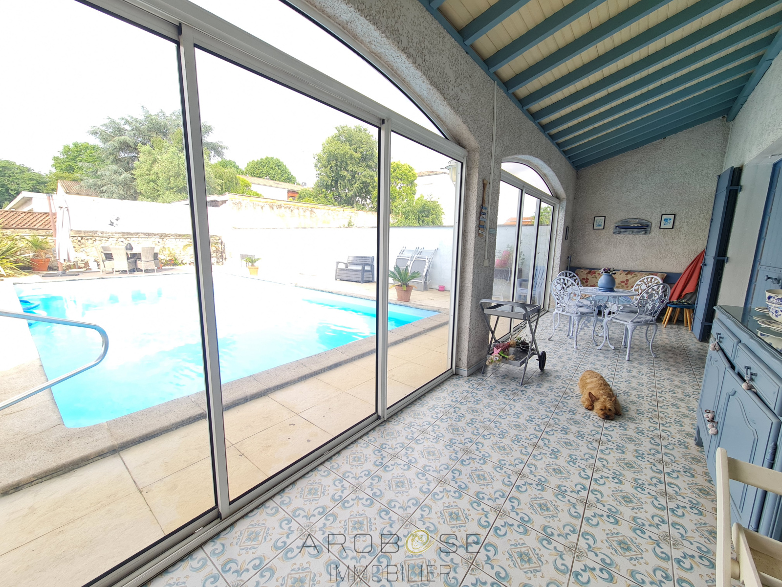 Garage indépendant et jardin arboré avec piscine complètent ce bien aux beaux volumes.